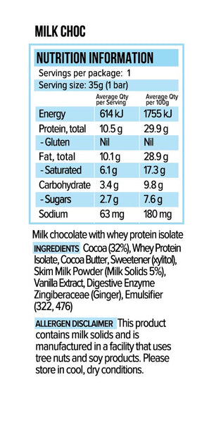 Cocoa (32%), Whey Protein Isolate, Cocoa Butter, Birch Natural Sweetener (967), Skim Milk Powder, Milk Solids (5%), Vanilla Extract, Digestive Enzyme Zingiberaceae (Ginger), Emulsifier (322, 476).