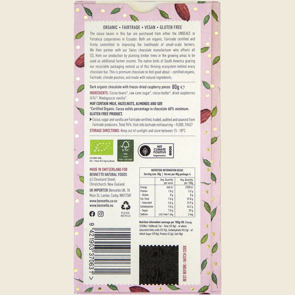 Pure tangy raspberry pieces loaded into rich, dark, organic chocolate.