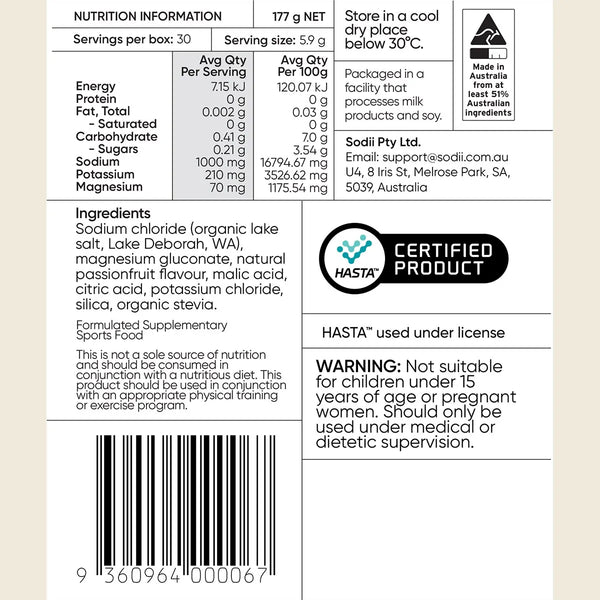 Sodium chloride (organic lake salt, Lake Deborah, WA), magnesium gluconate, natural passionfruit flavour, citric acid, malic acid, potassium chloride, silica, organic stevia.